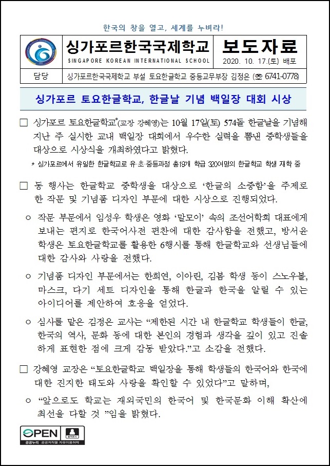 (º¸µµÀÚ·á)[½Ì°¡Æ÷¸£Çѱ¹±¹Á¦Çб³ 10.17º¸µµÀÚ·á] Åä¿äÇѱÛÇб³ Çѱ۳¯ ±â³ä ¹éÀÏÀå ´ëȸ ½Ã»ó½Ä °³ÃÖ.hwp