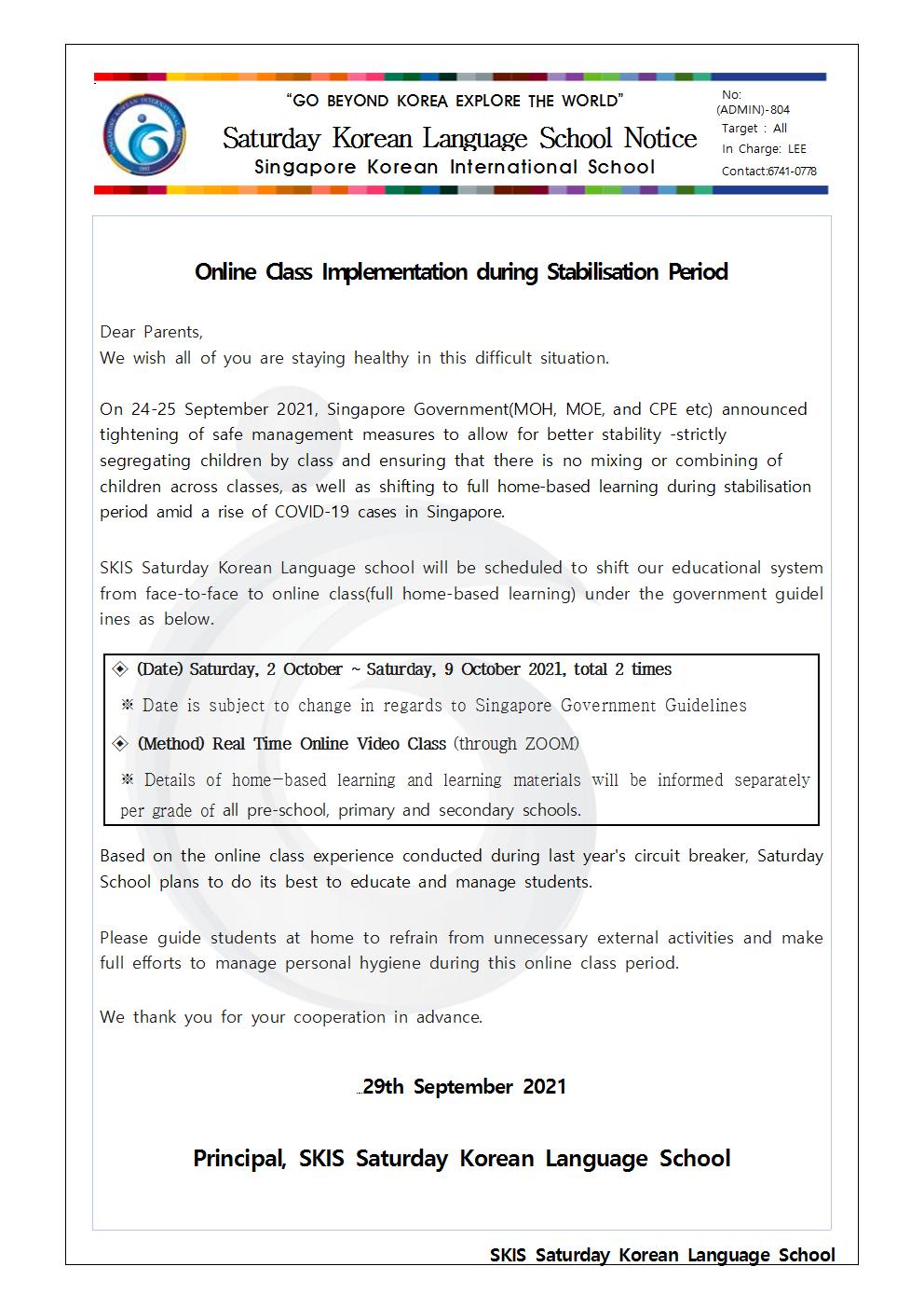 Á¦¸ñ [°¡Á¤Åë½Å¹®] Á¤ºÎÁöħ¿¡ µû¸¥ Åä¿äÇѱÛÇб³ ¿Â¶óÀÎ ¼ö¾÷ Àüȯ ¾È³» / SKIS Saturday School Notice Letter