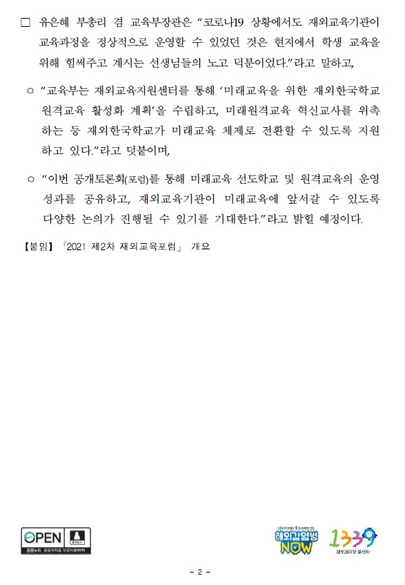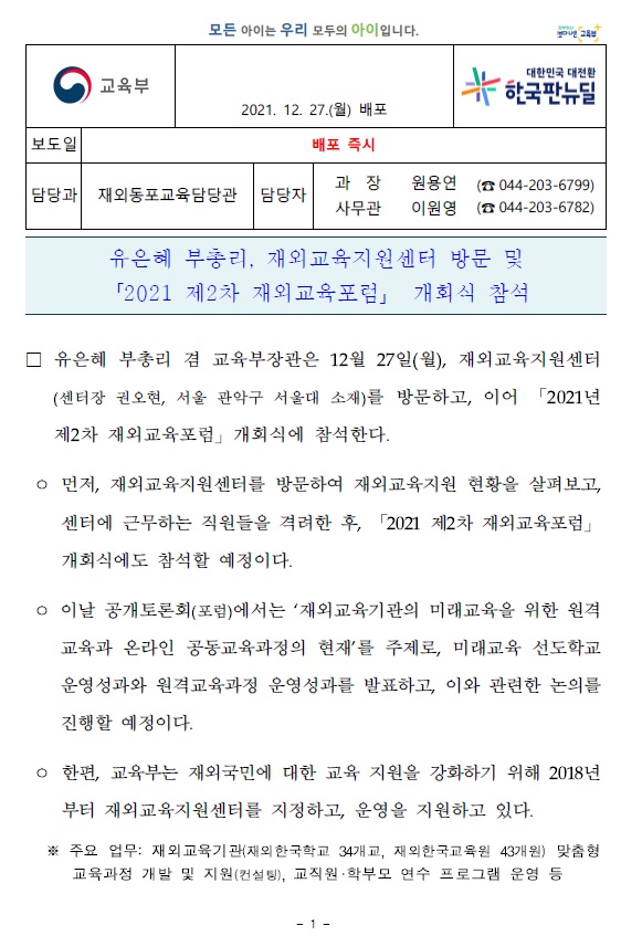Á¦¸ñ ±³À°ºÎ - À¯ÀºÇý ºÎÃѸ®, Àç¿Ü±³À°Áö¿ø¼¾ÅÍ ¹æ¹® ¹× '2021 Á¦2Â÷ Àç¿Ü±³À°Æ÷·³' °³È¸½Ä Âü¼®